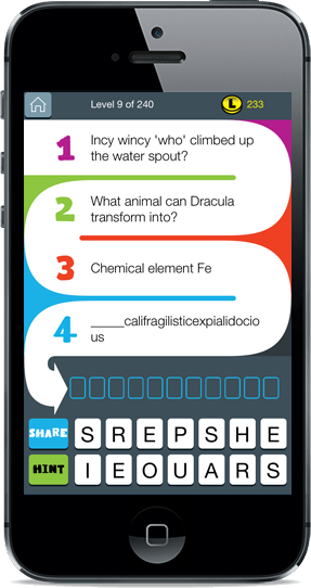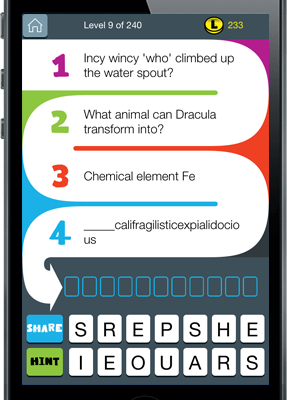Dlaczego jest to jednak jednoosobowa gra imprezowa? Otóż szukając tej gry i widząc cenę na poziomie zbyt_wielu_funtów natknąłem się na aplikację na Androida (na iOSa też pewnie jest, bo w tę stronę porty przeważnie następują) nazywającą się, fanfary, Linkee. Działa ona tak, że mamy pytania, pod którymi nie wyświetla się podpowiedź. Możemy ją odkryć płacąc za to monetką zdobywaną w grze, za te same monetki możemy kupić podpowiedź. Na samym dole puste pola pokazujące ile liter ma odpowiedź oraz wybór liter, z których układamy hasło.